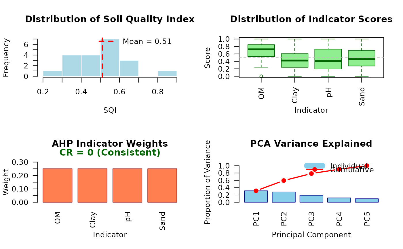 Creates a comprehensive 2x2 multi-panel visualization showing multiple aspects of the SQI analysis results. This function provides a quick overview of the analysis by displaying distribution, indicators, weights, and scree plots together.